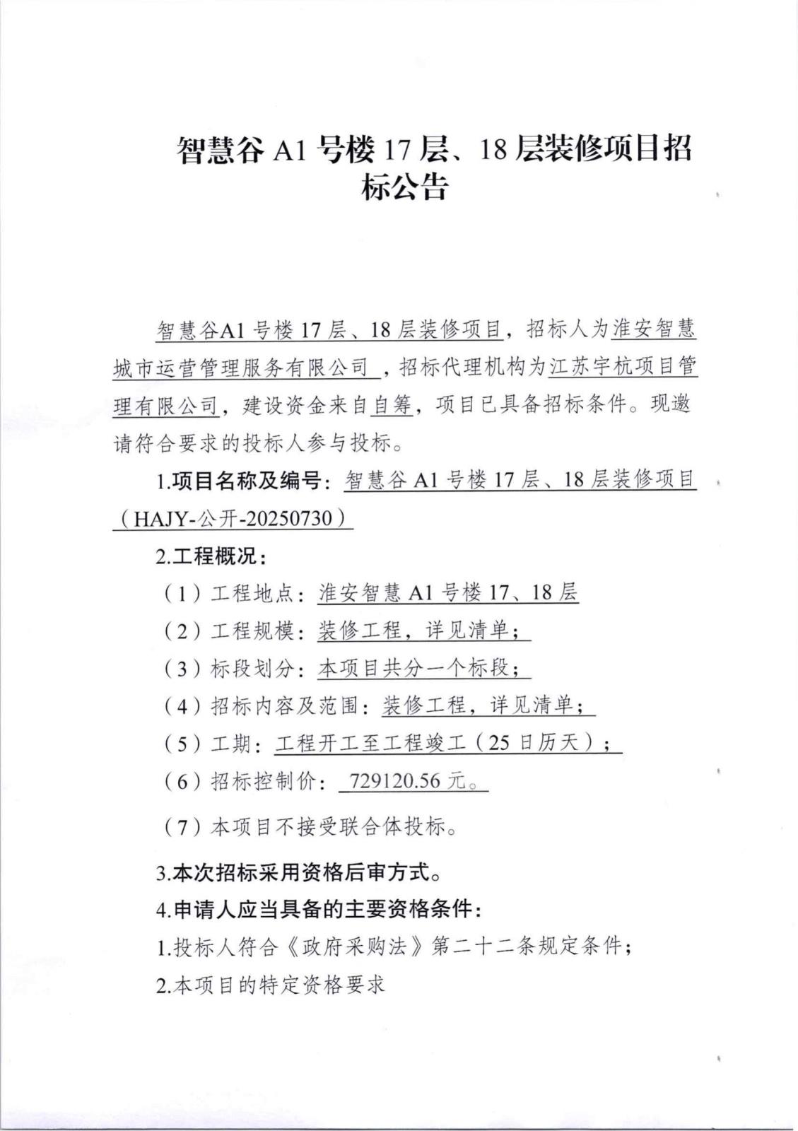 智慧谷A1號樓17層、18層樓裝修項目招標公告